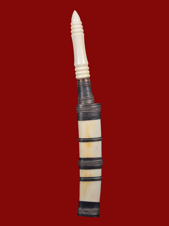 มีดหมอด้ามไม้ฝักไม้ไม่ทราบที่ ฝักไม้มีพันด้ายสายสินธุ์ ขนาดความยาวรวมด้าม 10 นิ้ว |