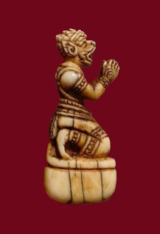 งาแกะหนุมานหน้าโขนพิมพิ์นั่งพนมมือวันทา ขนาดสูง1.5นิ้ว เก่าๆงามีอายุ ศิลป์สวยๆ ไม่ทราบที่ |
