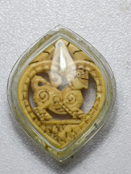 กะลาแกะรูปราหู สุริยนต์-จันทรา หลังจารย์ สวยๆ ปิดทองเดิม ไม่ทราบที่ |