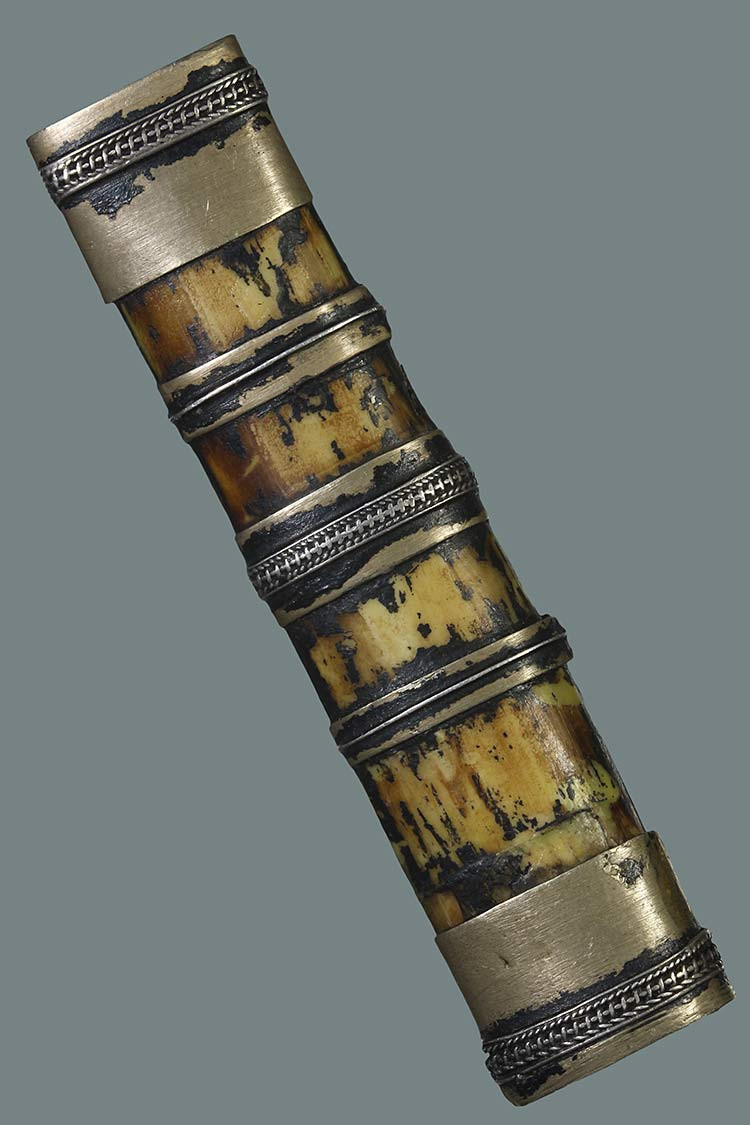 วัดใจ**เครื่องราง ปลอกมีดเนื้องา รัดด้วยแหมเงิน ยาว 2.5นิ้ว ไม่ทราบที่.....ตามสภาพครับ |
