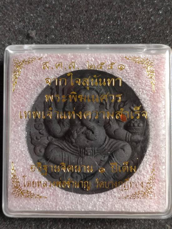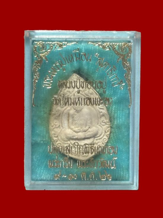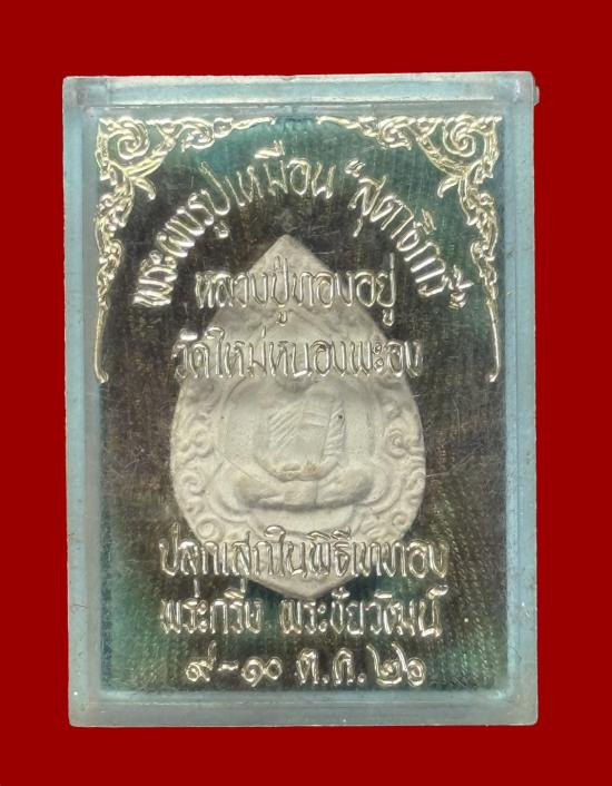 พระผงพุทธซ้อน เนื้อผงพุทธคุณ หลังรููปหลวงพ่อชำนาญวัดบางกุฎีทอง ปี 2547 พระผงจัมโบ้หนุนดวง หนุนให้ก้าวหน้า ด้านหน้าเป็นรูป หลวงปู่สุรินทร์หนุนซ้อนหลวงพ่อชำนาญ |