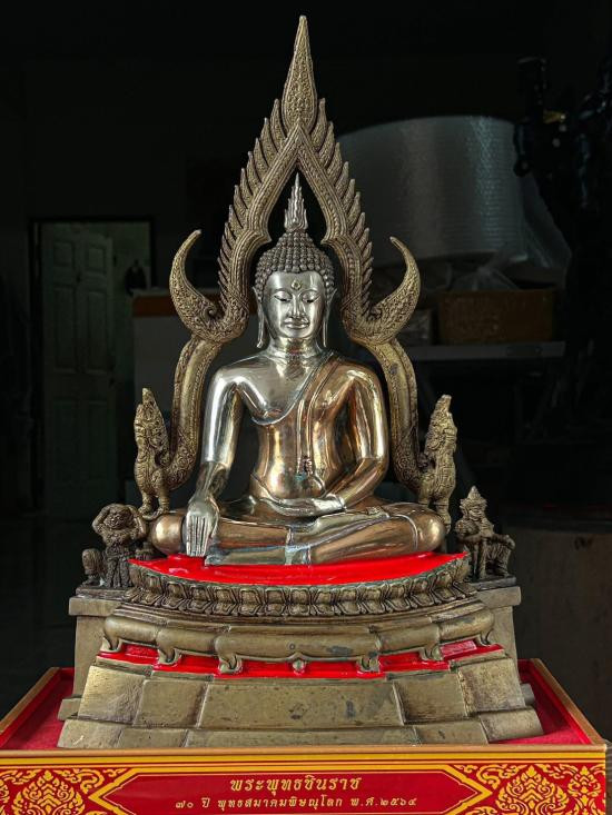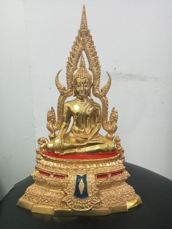 พระพุทธชินราช ฐานหน้าอกเลาเนื้อทองเหลืองขัดมัน หน้าตัก 5 นิ้ว ขนาดความสูงรวมซุ้ม 12 นิ้ว |
