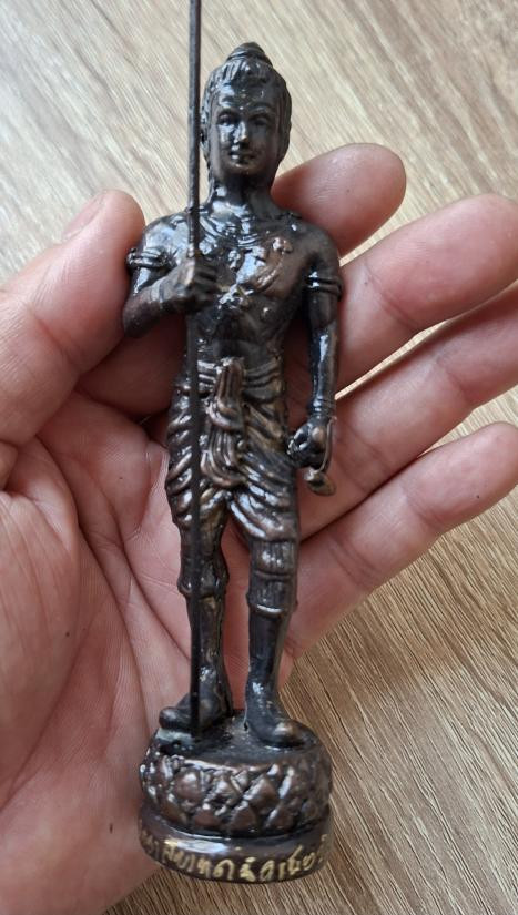 สมเด็จพระนเรศวรมหาราช ทรงประกาศอิสสระภาพ 400 ปี ( ยืนหลั่งน้ำสิโนทก ) ณ.วัดพรหมสุวรรณสามัคคี พ.ศ.2527 สูงรวมฐาน 12 นิ้ว เนื้อโลหะรมมันปู ผิวหิ้ง 2 ถอด !! |