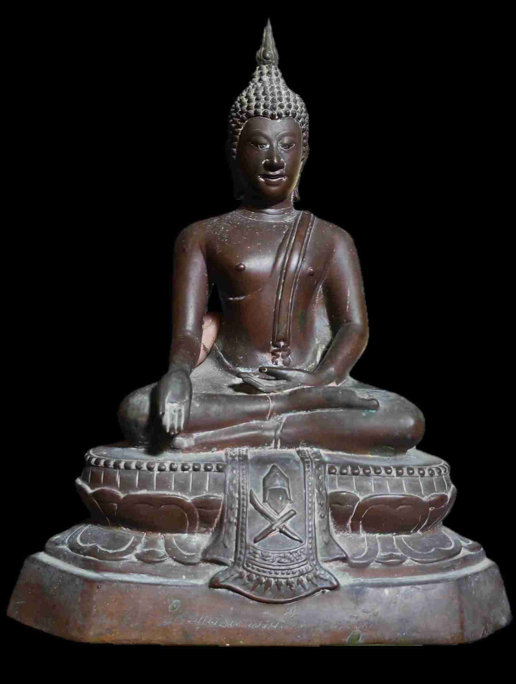 พระสัมพุทธภูธรินทร์ พระบูชารุ่นแรกของกรมตำรวจ ในหลวงรัชกาลที่ 9 เสด็จเททอง พ.ศ.2516 หน้าตัก 5 นิ้ว เนื้อโลหะรมมันปูผิวหิ้ง ดินไทยสีดำ-แดง ตอกโค๊ต ตอกเลข หายากครับ !! |