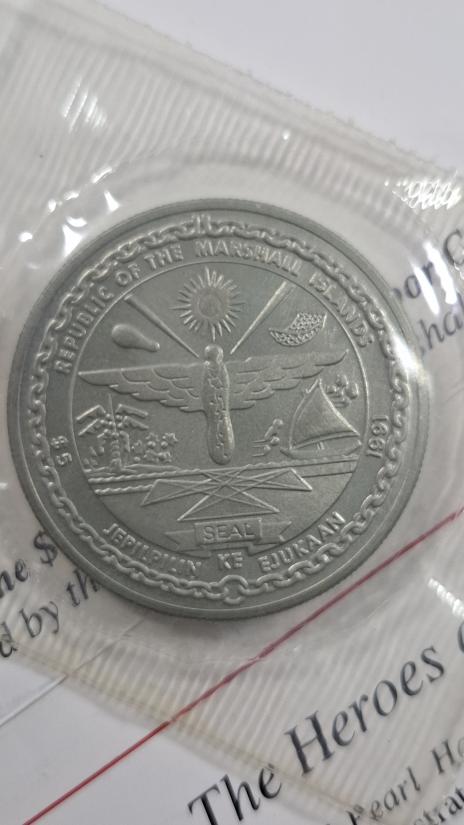 เหรียญกษาปณ์ที่ระลึก "วีรบุรุษแห่งเพิร์ลฮาร์เบอร์" (Heroes of Pearl Harbor) ชนิดราคา 5 ดอลลาร์ ออกโดยหมู่เกาะมาร์แชลล์ในปี 1991 |