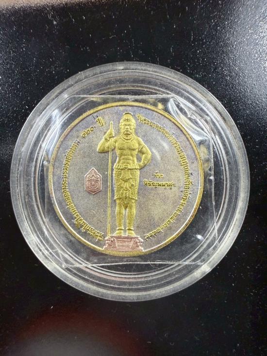 เหรียญพระนิรโรคันตราย หลัง ท้าวหิรัญพนาสูร เนื้อโลหะชุบสามกษัตริย์ ที่ระลึก 102 ปีพระราชสมภพ พระมงกุฎเกล้าเจ้าอยู่หัว 2544