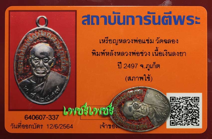 เหรียญ หลวงพ่อแช่ม วัดฉลอง พิมพ์หลังหลวงพ่อช่วง เนื้อเงินลงยา ปี2497 จ.ภูเก็ต หายากนานๆจะเจอ พร้อมบัตรรับรองพระแท้จากการันตีพระสบายใจได้พระแท้แน่นอน ค่ะ