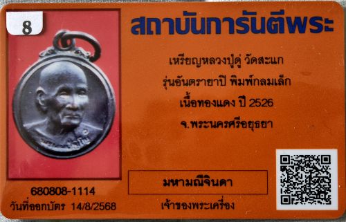 ชื่อพระเครื่อง เหรียญหลวงปู่ดู่ วัดสะแก ปี 2526 เนื้อทองแดง รุ่นอันตรายาปิ พิมพ์กลมเล็ก สวยเดิมๆ หายาก พร้อมบัตรรับรองครับ