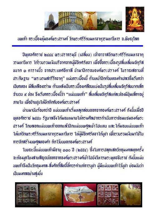 แผ่นนพศูล , นพเก้า หรือ นพรั ต น์ ( แผ่นกระเบื้องโมเสกสีทองนำเข้าจากประเทศอิตาลี ) จากองค์ พระปรางค์เก่า วัดพระศรีรัตนมหาธาตุ " ( วัดใหญ่ , วัดหลวงพ่อพระพุทธชินราช ) อีกทั้งอาบแสงตะวัน แสงจันทรา และผ่านพิธีพุทธาภิเษก .. มามากกว่า 106 ปี ปีพุทธศักราช ๒๔๔๔ ตรงกับรัชสมัยพระบาทสมเด็จพระจุลจอมเกล้าเจ้าอยู่หัว รัชกาลที่ ๕ พระปรากรมมุนี (เปลี่ยน) เจ้าอาวาส "วัดพระศรีรัตนมหาธาตุวรมหาวิหาร"จังหวัดพิษณุโลก ซึ่งประชาชนทั่วไปคุ้นเคยและนิยมเรียกขานกันจนติดปาก ในชื่อ "วัดพระศรี" หรือ "วัดใหญ่" หรือ "วัดหลวงพ่อพระพุทธชินราช" ได้รวบรวมเงินบริจาคผู้มีจิตศรัทธา เพื่อซื้อกระเบื้องรูปสี่เหลี่ยมจัตรัสขนาด ๑ ตารางนิ้วจากประเทศอิตาลิ นำมาประดับกลีบขนุนซึ่งอยู่ส่วนบนของ "องค์พระปรางค์พระศรีมหาธาตุ" ปูชนียสถานสำคัญและมีความศักดิ์สิทธิ์ที่สุดที่ใช้ประดิษฐาน "พระบรมสารีริกธาตุ" แผ่นกระเบื้องนี้ ด้านหน้าปิดด้วยทองคำแท้แผ่นบางๆมีสีเหลืองอร่าม ด้านหลังเป็นกระเบื้องเคลือบ แบ่งเป็นรูปสี่เหลี่ยมจัตรัสขนาดเล็กจำนวน ๙ รูป จึงเรียกกระเบื้องนี้ว่า "แผ่นนพเก้า" แต่ละช่องมีจุด ๓ จุด ๓x๙ = ๒๗ และ ๒ ๗ =๙ บางแผ่นแต่ละช่องมี ๔ จุด ๔x๙ = ๓๖ และ ๓๖ = ๙ และ พระบาทสมเด็จพระจุลจอมเกล้าเจ้าอยู่หัว รัชกาลที่ ๕ ได้ถวายกระเบื้องประดับยอดองค์พระปรางค์หรือ "นพศูล" มีลักษณะแตกต่างจากแผ่นนพเก้า คือ ในช่องตรงกลางมีเพียง 1 จุด.... ในปีพุทธศักราช ๒๕๕๐ กรมศิลปากรได้ดำเนินการบูรณะองค์พระปรางค์พระศรีมหาธาตุ โดยลอกแผ่นนพเก้าออกทั้งหมดแล้วนำออกให้พุทธสนิกชนได้บูชา ซึ่งแผ่นนพเก้านี้มีอายุกว่า 106 ปี และ ในการปลุกเสกวัตถุมงคลของทางวัดทุกครั้งจะต้องผูกโยงสายสิญจน์ออกจากองค์ พระปรางเข้าไปในปูชนียสถานที่ใช้ประดิษฐานพระประธานองค์ใหญ่ หรือ "วิหารหลวงพ่อ" หรือ "วิหารหลวงพ่อพระพุทธชินราช" ดังนั้น แผ่นนพเก้าจึงเป็นวัตถุมงคล-สิ่งศักดิ์ที่ควรค่าแก่การบูชาเป็นอย่างยิ่ง เป็นสิริมงคลอย่างสูง .... นายวินัย ชาญวิชัย ไวยาวัจกรฝ่ายประชาสัมพันธ์ วัดพระศรีรัตนมหาธาตุวรมหาวิหาร ( วัดใหญ่ ) อ.เมือง จ.พิษณุโลก เปิดเผยว่า ขณะนี้วัดพระศรีรัตนมหาธาตุวรมหาวิหาร สถานที่ประดิษฐานพระพุทธชินราช กำลังมีการบูรณะพระปรางค์ประจำวัด ศิลปะสมัยอยุธยา ที่ตั้งอยู่ด้านหลังวิหารพระพุทธชินราช ซึ่งนักวิชาการคาดว่าจะสร้างคร่อมเจดีย์ทรงพุ่มข้าวบิณฑ์ ศิลปะสมัยสุโขทัย และภายในเป็นที่ประดิษฐานองค์พระสารีริกธาตุ เนื่องจากมีสภาพทรุดโทรมลงไปมาก เกรงว่าจะเป็นอันตรายต่อประชาชนที่มาเคารพสักการะสิ่งศักดิ์