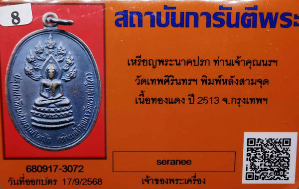 เหรียญพระนาคปรก ท่านเจ้าคุณนรฯ วัดเทพศิรินทรฯ พิมพ์หลังสามจุด เนื้อทองแดง ห่วงเดิม ปี2513 จ.กรุงเทพฯ + บัตรG-pra สภาพเดิมค่ะ สภาพตามรูปทุกประการค่ะ