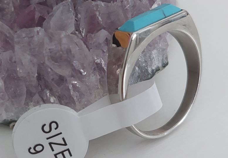 แหวนหัวเทอร์ควอยซ์หรือหินการเวก ตัวเรือนแหวนเป็นสแตนเลสขัดเงาไม่ลอกไม่ดำแข็งแรงทนทาน ขนาดแหวนเบอร์9 |