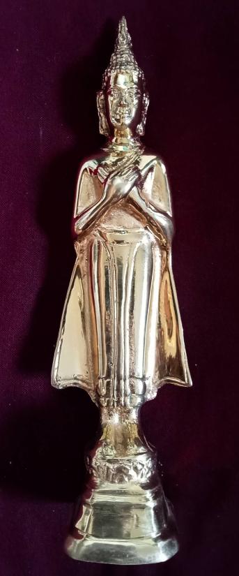 พระบูชา ปางรำพึง ขนาดสูงประมาณ 9 นิ้ว ประทับยืนบน ฐาน 4 เหลี่ยม มีบัวคว่ำบัวหงาย ใต้ฐานอุดดินไทย เนื้อทองเหลืองสวยกริบ สภาพเก่าเก็บในถุงพลาสติกไม่ผ่านการใช้ตามรูป ส่งฟรีทั่วไทย รับประกันตามกฎครับ |