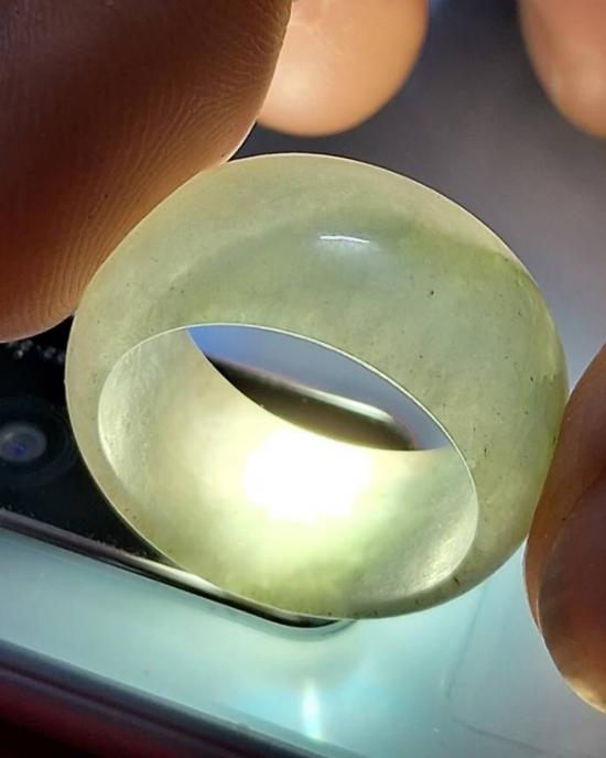แหวนหยกท้องปลิง หยกพม่าแท้ 100 % (แสงส่องผ่าน) สีเขียวอ่อน ลายธรรมชาติ สวยมากๆ เส้นผ่าศูนย์กลาง 1.8 ซม. หนา 1.1-1.2 ซม. หายาก (กท.45)