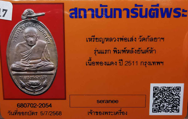 เหรียญหลวงพ่อเส่ง วัดกัลยาฯ รุ่นแรก พิมพ์หลังยันต์ห้า เนื้อทองแดง ห่วงเดิม ปี2511 จ.กรุงเทพฯ + บัตรG-pra สภาพสวยเดิมค่ะ |