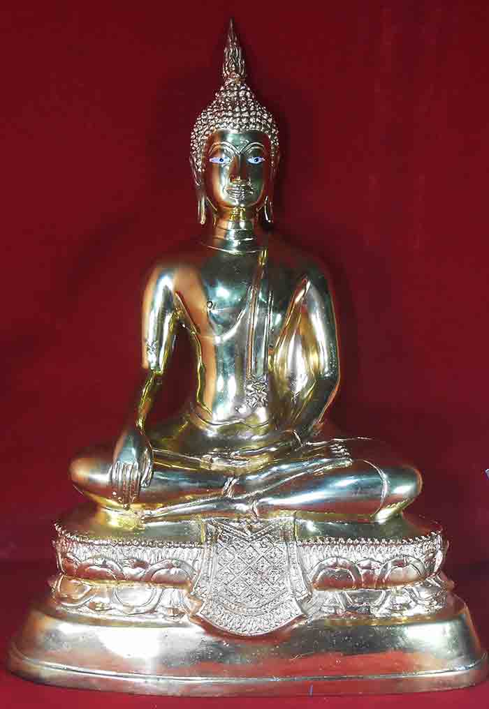 พระพุทธรูปสุโขทัย ปางมารวิชัย ขนาดบูชา 9 นิ้ว เนื้อทองเหลือง ใต้ฐานบรรจุเหรียญมหาลาภ เสาร์ 5 ปี 2553 หลวงพ่อลออ วัดหนองหลวงปลุกเสก