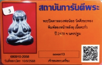 พระปิดตาหลวงพ่อน้อย วัดศรีษะทอง พิมพ์สองหน้าหลังอุ เนื้อชินตะกั่ว ปี 2478 จังหวัดนครปฐม พร้อมบัตรรับรอง