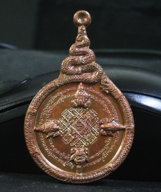 ด้านหน้าเหรียญได้นำพระยันต์ของพระพรหมที่เป็นตำรับเก่าแก่เป็นผูกกระดาษฝาง ที่ตกทอดกันมา ในตำราบอกบรรยายไว้มากมายสรุปได้อย่างนี้ว่า "ยันต์นี้ให้อธิษฐานตามแต่เธอจะปรารถนา จะคิดการสิ่งใด ก็สำเร็จเลิศเลอ ประเสริฐ ยิ่งนักแล" มีพญานาคขดล้อมยันต์พระพรหม ตวัดหางเป็นเลข ๙ เป็นสัญลักษณ์การเป่ายันต์พรหมครั้งที่ 9 ของหลวงพ่อ