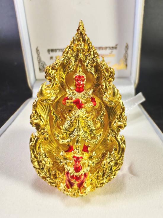 พุทธศิลป์ เหรียญท้าวเวสสุวรรณ รุ่น ทรัพย์เทวา วัดถ้ำเขาชะอางค์ จังหวัดกาญจนบุรี หน้าเทพพิมพ์ทรงจำปา หลังพญาเต่าเรือน(เต่ามังกร) รกที่.11 เนื้อบรอนซ์ชุบทองกายแดงพื้นแดง No.227 เลขสวย ราคาจอง 999 บาท กล่องเดิม
