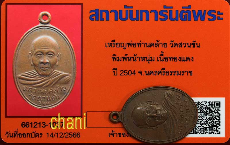 เหรียญ พ่อท่านคล้าย วัดสวนขัน พิมพ์หน้าหนุ่ม เนื้อทองแดง ปี2504 จ.นครศรีธรรมราช สภาพสวยๆ เดิมๆ พร้อมบัตรรับรองจากจีพระอุ่นใจได้ ค่ะ