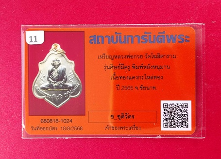 เหรียญหลวงพ่อกวย ชุตินธโร วัดโฆสิตาราม รุ่นศิษย์มีครู เนื้อกะไหล่ทองพ่นทราย หลังหนุมาน ปี 2565 บัตรรับรองG พระ |