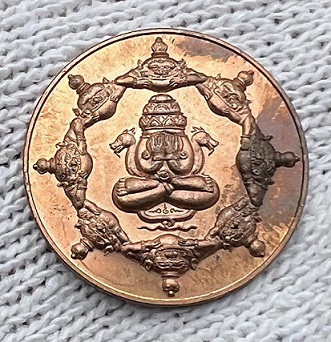 มงคลจักรวาลขุนพันธ์พุทธาคมเขาอ้อ เหรียญ ปิดตาพังพกาฬ รุ่นแรก ปี 2544 เนื้อทองแดง ขนาด 4 ซม. |