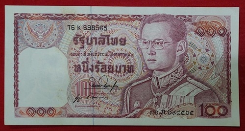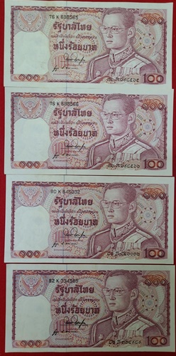 ธนบัตร 100 บาท ในหลวงรัชกาลที่ 9 แบบ 12 ด้านหลังช้างแดง จำนวน 4 ฉบับ สภาพ UNC สวย,ใหม่,ไม่ได้ใช้,ไม่มีรอยพับ ลายเซ็น สมหมาย ฮุนตระกูล - นุกูล ประจวบเหมาะ เลข 6หลัก |