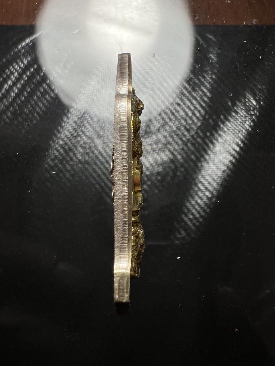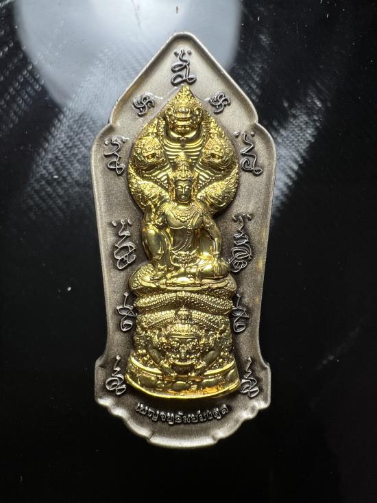 เหรียญเบญจทรัพย์มงคลพลิกดวงเก้า เนื้อซาตินขาวหน้ากากทองทิพย์ วิหารองค์พ่อจตุคามรามเทพนราธิวาส |