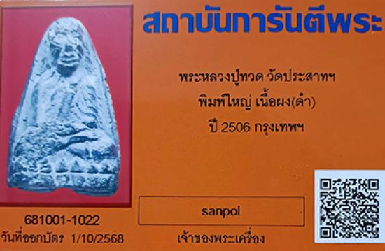 หลวงปู่ทวดพิมพ์ใหญ่ ปลายแหลม(เนื้อดำ) วัดประสาท กรุงเทพฯ องค์พระมีขนาด 2.2 x 3.3 cm จัดสร้างเมื่อปี 2506 โดยพระครูสมุหอำพล (เจ้าอาวาสวัดประสาทในขณะนั้น) ซึ่งมวลสารประกอบด้วยผงพระที่แตกหักจากกรุบางขุนพรหม(ปี2500) และชนวนกริ่งวัดสุทัศน์(ทำให้เกิดสมินเขียวมาจากด้านในองค์พระ) โดยทำพิธีพุทธาภิเษกโดยมีพระเกจิจากทั่วประเทศร่วมปรกปลุกเสกหมู่มากกว่า ๒๐๐ รูป อาทิเช่น ลป.โต๊ะ,ลพ.พรหม,ลพ.จง,ลพ.อั้น,ลป.เทียน ฯลฯ.......... องค์พระดูง่าย , มีหน้า มีตา แท้ล้าน%การันตีโดย " g-pra " คับ