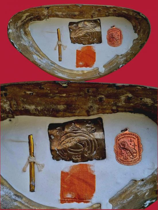 ใต้ฐานเทปูน ฝังเหรียญเสือเผ่น + ตะกรุดม้วนผูกสายสิญจน์ + แผ่นตะกรุดจารมือ + จีวรหลวงพ่อกำจัด + หมายเลข 97 + ติดพลอยหน้าผากหลวงพ่อ สวยงาม เคาะเดียวแดงครับ |