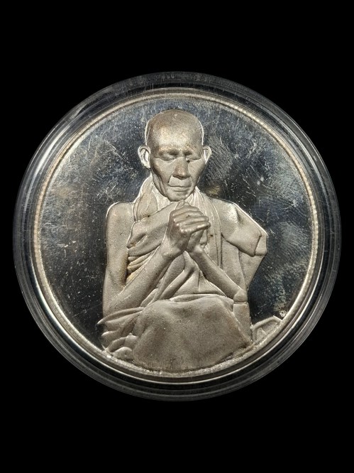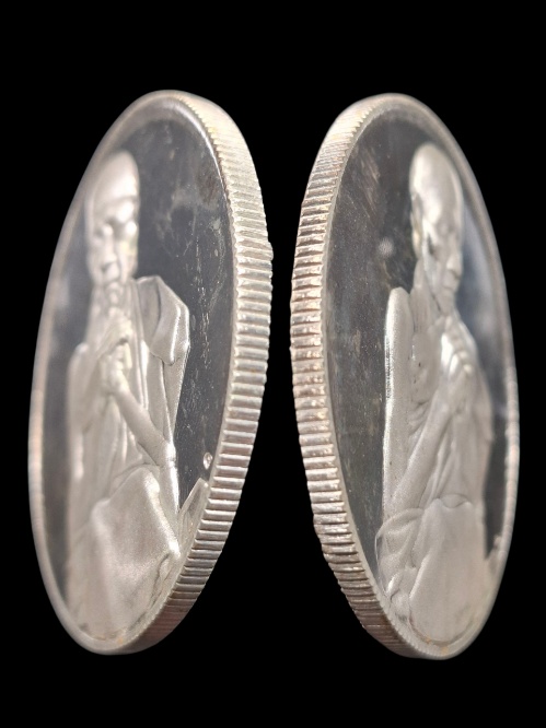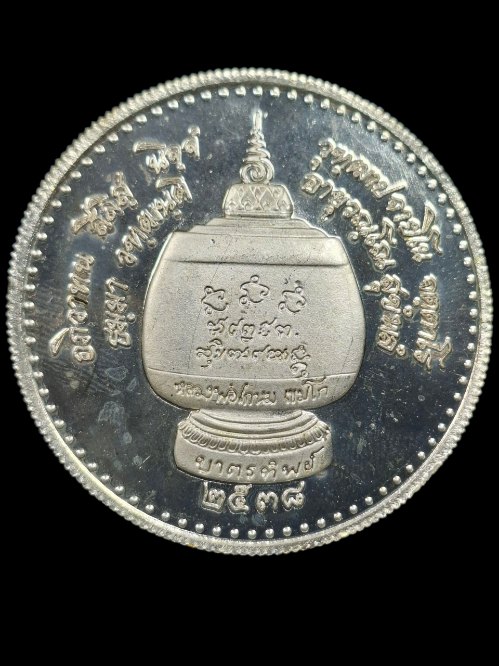 เหรียญบาตรน้ำมนต์หลวงพ่อเกษม เขมโก รุ่นบาตรทิพย์ เนื้อทองแดง กะไหล่เงิน/ชุบเงิน ขนาด 5 ซม. ปี 2538 ตอก นะ |