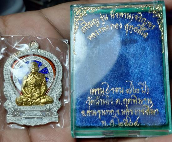 เหรียญนั่งพานหลวงพ่อทอง เนื้อเงินลงยา หน้าทองคำ พร้อมกล่อง