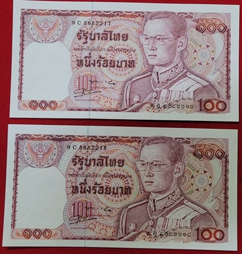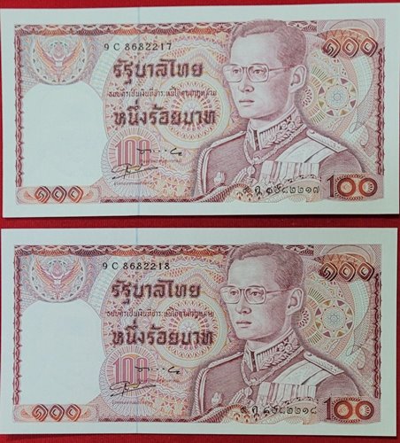 ธนบัตร 100 บาท ในหลวงรัชกาลที่ 9 แบบ 12 ด้านหลังช้างแดง หมายเลขเรียงกัน จำนวน 2 ฉบับ สภาพ สวย,ใหม่,ไม่ผ่านการใช้,UNC ลายเซ็น ประมวล - กำจร หมายเลข 9C 8682217 และ 8682218