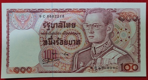 ธนบัตร 100บาท ร.9 แบบ 12 หลังช้างแดง หมายเลข 9C 8682218 - ๙ค ๘๖๘๒๒๑๘ ลายเซ็น ประมวล - กำจร สภาพ UNC