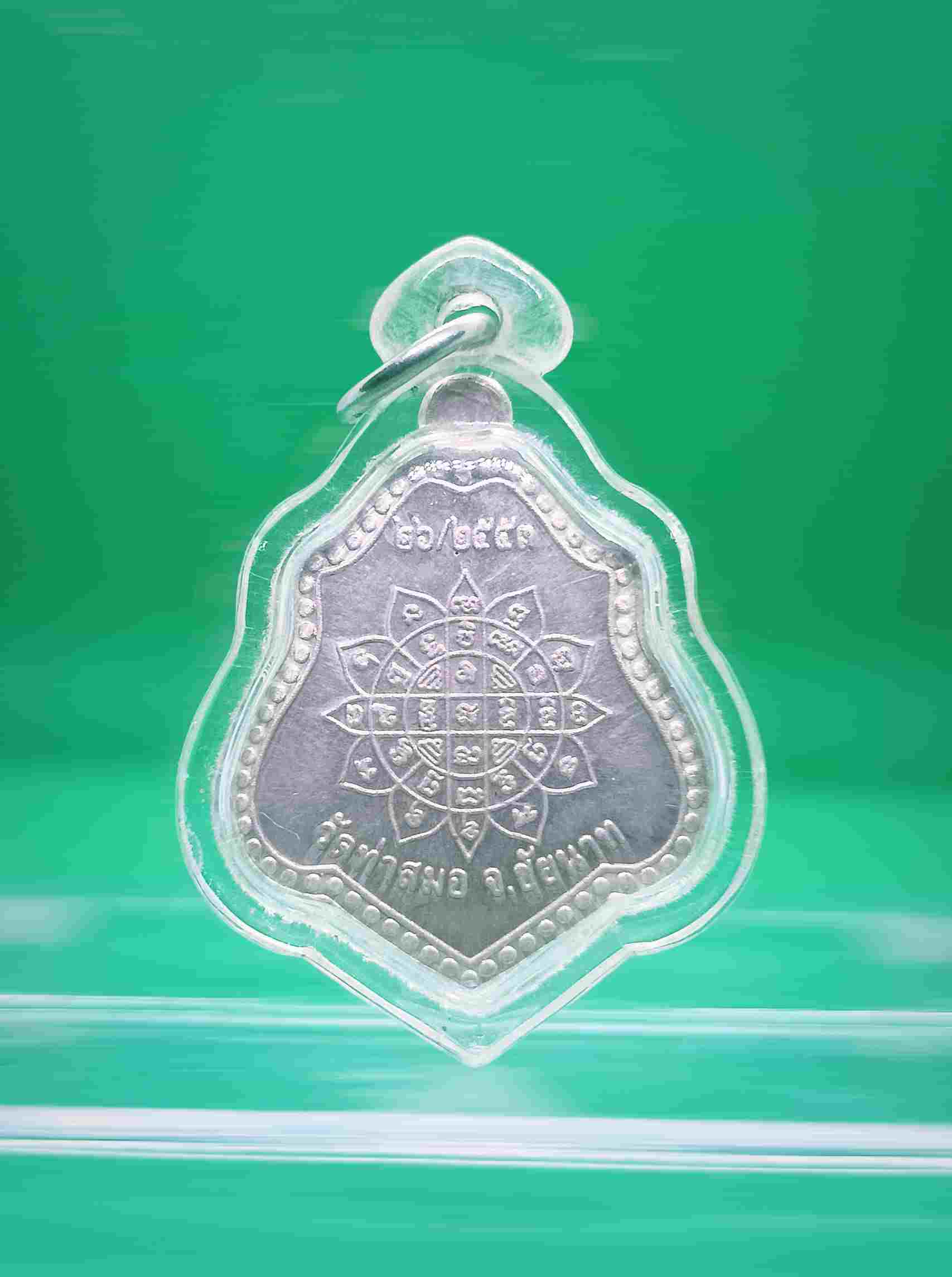 เหรียญนั่งเต็มองค์ หลวงพ่อเกาะ วัดท่าสมอ เนื้อเงิน ชัยนาท เลี่ยมพลาสติกกันน้ำ หน้าเหรียญมีรอยจารมือ |