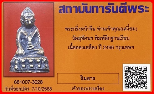 พระกริ่งหน้าจีน ท่านเจ้าคุณ(เสงี่ยม) วัดสุทัศนฯ พิมพ์ลึกฐานเรียบ เนื้อทองเหลือง มีบัตรรับรองจีพระ เคาะเดียว |