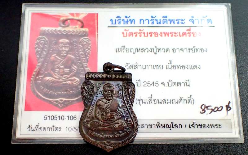 เหรียญเลื่อนอาจารย์ทอง วัดสำเภาเชย ปี 2545 สภาพสวยๆผิวเดิมๆ พร้อมบัตรการันตี ไม่มีกล่องนะครับ |