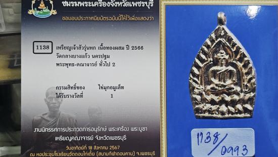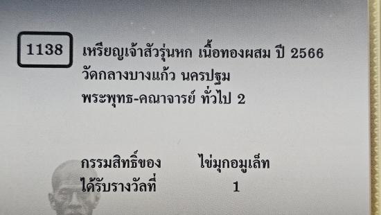เหรียญเจ้าสัว รุ่น6 วัดกลางบางแก้ว จ.นครปฐม ปี 2566 เนื้อทองเหลือง พร้อมใบประกาศติดรางวัลที่ 1 งานเพชรบุรี ครับ |