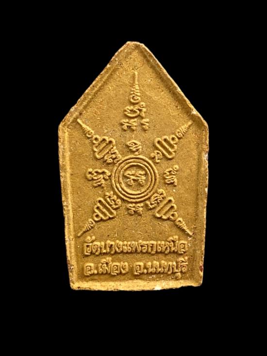 ด้านหน้าเป็นพระพุทธนั่งในซุ้มเรือนแก้วงดงาม ด้านหลังมียันต์มหาเมตตาและจารอาคม เสริมความเป็นสิริมงคล