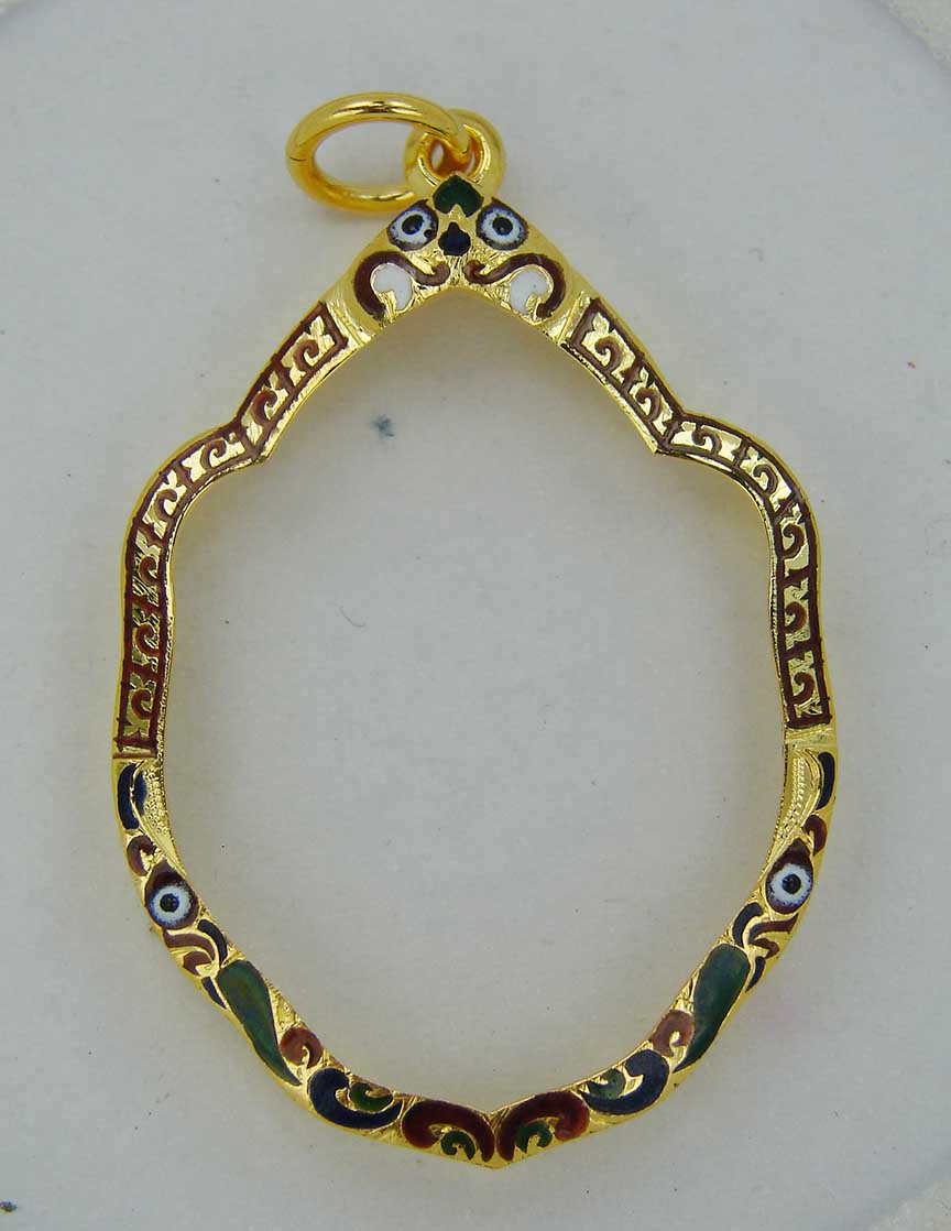 กรอบทอง ลงยาเต็ม ยกซุ้ม หัวสิงห์ ข้างแกะลาย ใส่เหรียญ **มังกรคู่** หลวงปู่หมุน หรือ ขนาดไกล้เคียง งานขึ้นมือ น้ำหนัก 4.38 กรัม ( ขนาดความสูง 4 ซม. กว้าง 2.6 ซม. วัดจากขอบใน ) เปอร์เซ็นต์ทอง 65-70 เปอร |