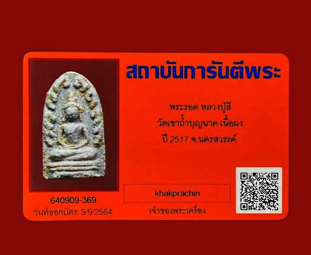 พระรอด หลวงปู่สี วัดเขาถ้ำบุญนาค เนื้อผงพุทธคุณ ปี 17 สวยเดิมๆ พร้อมบัตรรับรองครับ |