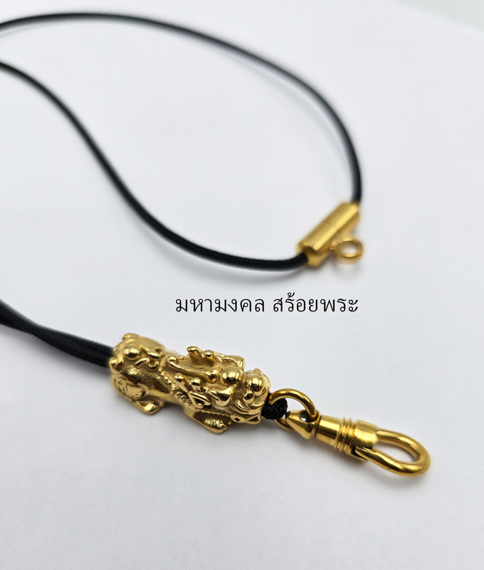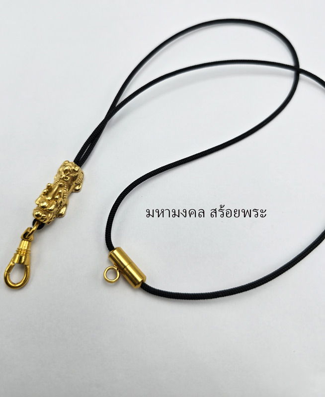 สร้อยเชือกร่มแต่งด้วย ปี๊เซียะทองเลเซอร์ พร้อมก้ามปูสปริง สำหรับแขวนพระ 2 องค์ ยาว 24 นิ้ว |
