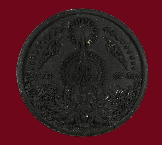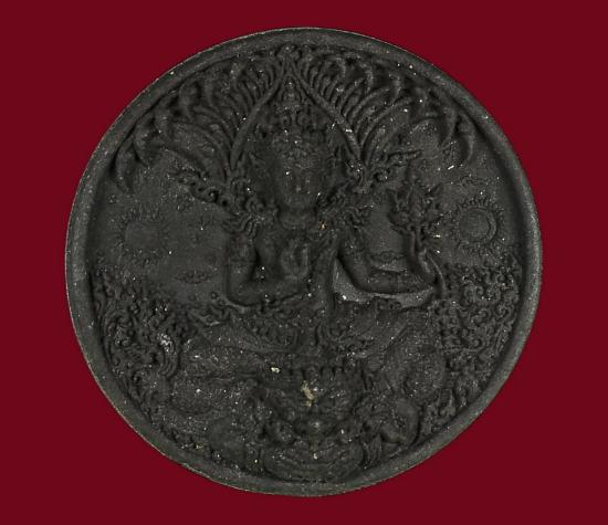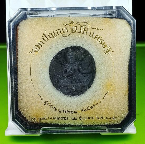 พระเทวราชโพธิสัตว์ จตุคามรามเทพ อภิปัญญามหาเศรษฐี ผู้มีปัญญาประดุจดั่งมีทรัพย์ โดยมูลนิธิศิลปกรรม พ.ศ. 2550 (พุทธศิลป์รูปแบบของ อาจารย์เฉลิมชัย โฆษิตพิพัฒน์) เนื้อผงพุทธคุณดำ ขนาด 3.5 cm. สภาพสมบูรณ์ ไม่มีตำหนิ พร้อมกล่องเดิม |