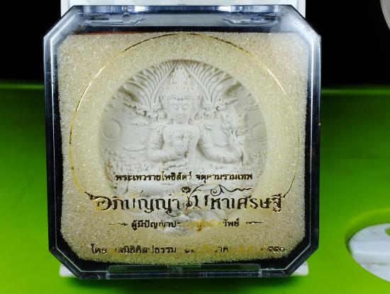 พระเทวราชโพธิสัตว์ จตุคามรามเทพ อภิปัญญามหาเศรษฐี ผู้มีปัญญาประดุจดั่งมีทรัพย์ โดยมูลนิธิศิลปกรรม พ.ศ. 2550 (พุทธศิลป์รูปแบบของ อาจารย์เฉลิมชัย โฆษิตพิพัฒน์) เนื้อผงพุทธคุณขาว ขนาด 5.0 cm. สภาพสมบูรณ์ ไม่มีตำหนิ พร้อมกล่องเดิม |