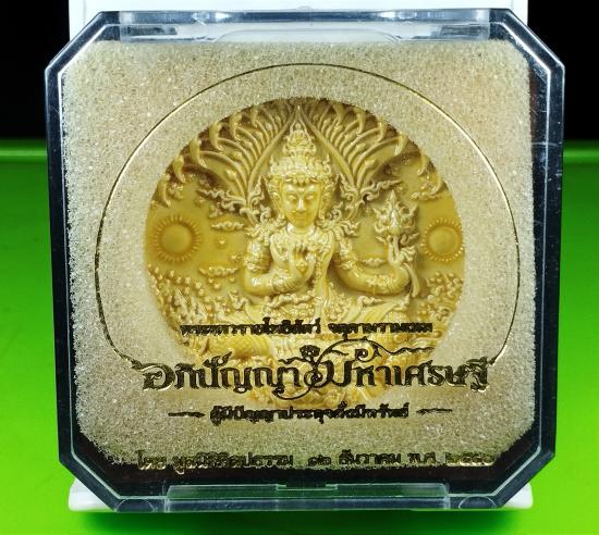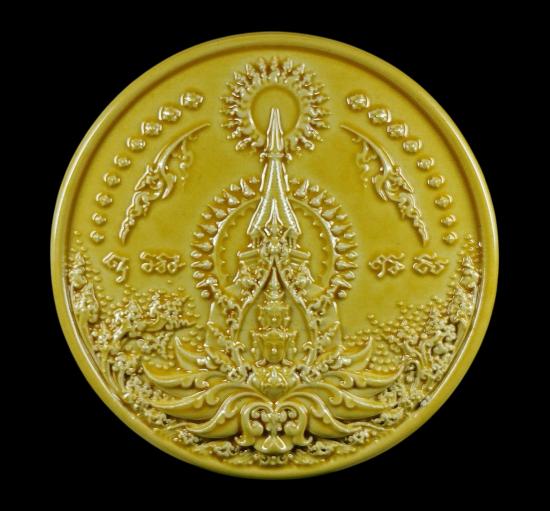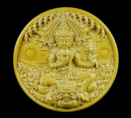 พระเทวราชโพธิสัตว์ จตุคามรามเทพ อภิปัญญามหาเศรษฐี ผู้มีปัญญาประดุจดั่งมีทรัพย์ โดยมูลนิธิศิลปกรรม พ.ศ. 2550 (พุทธศิลป์รูปแบบของ อาจารย์เฉลิมชัย โฆษิตพิพัฒน์) ลูกเคลือบสีเหลือง ขนาด 5 cm. สภาพสมบูรณ์ ไม่มีตำหนิ พร้อมกล่องเดิม |