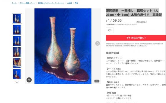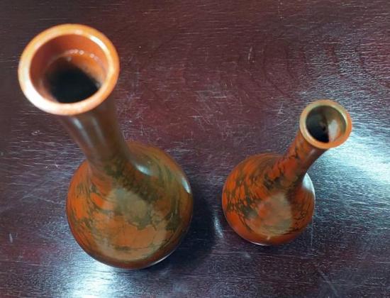 แจกันเก่าเก็บเนื้อทองเหลืองลงยา (มูราชิโด)งานของญี่ปุ่น สีส้ม ลายทอง 2 ขนาด สูง 10 นิ้ว กับ 7.5 นิ้ว |