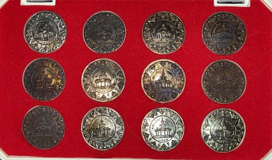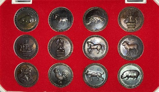 รายละเอียด เหรียญบูรณะหลังเมืองนครศรีฯ 12 นักษัตร เนื้อทองแดงรมดำ ปี2547 (ขาดเหรียญปีเถาะ แต่มีปีมะโรงซ้ำมาให้ 2 เหรียญ) พร้อมกล่องเดิม