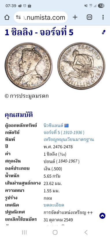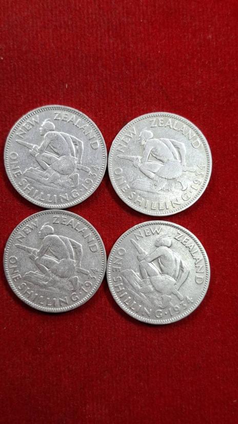 เหรียญ 1 ชิลลิงของนิวซีแลนด์ที่ผลิตในปี ค.ศ. 1934 ด้านหน้า: เป็นพระบรมสาทิสลักษณ์ของพระเจ้าจอร์จที่ 5 แห่งสหราชอาณาจักร เนื้อเงิน 56% ทั้งหมด 4เหรียญ |