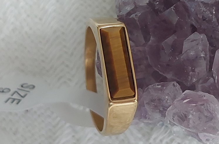แหวนหัวไทเกอร์อายหรือหินตาเสือ ตัวเรือนแหวนเป็นสแตนเลสงานเลเซอร์ทองแข็งแรงทนทาน ขนาดแหวนเบอร์9 |
