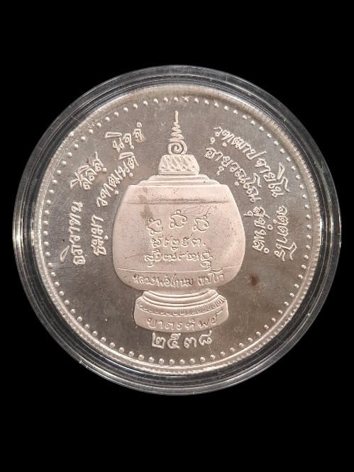 เหรียญบาตรน้ำมนต์หลวงพ่อเกษม เขมโก รุ่นบาตรทิพย์ เนื้อทองแดง กะไหล่เงิน ขนาด 5 ซม. ปี 2538 ตอก นะ |