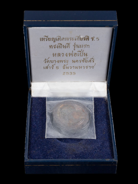 วัดใจ....เหรียญ ร.5 ทรงยินดี รุ่นแรก เนื้อเงิน ปี2535 หลวงพ่อเปิ่น วัดบางพระ พร้อมกล่อง